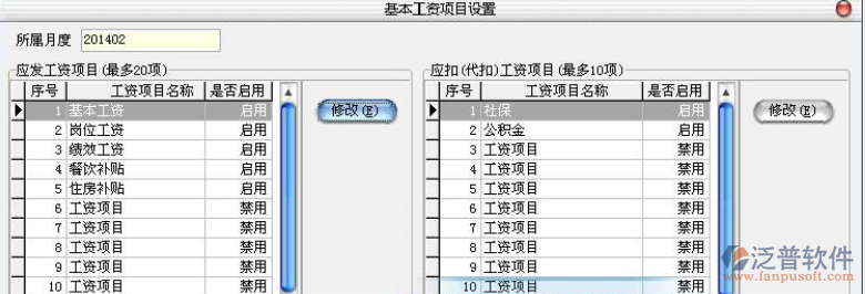 可指定應(yīng)發(fā)以及應(yīng)扣的工資項(xiàng)目,應(yīng)發(fā)工資最多10項(xiàng),應(yīng)扣工資最多5項(xiàng)。