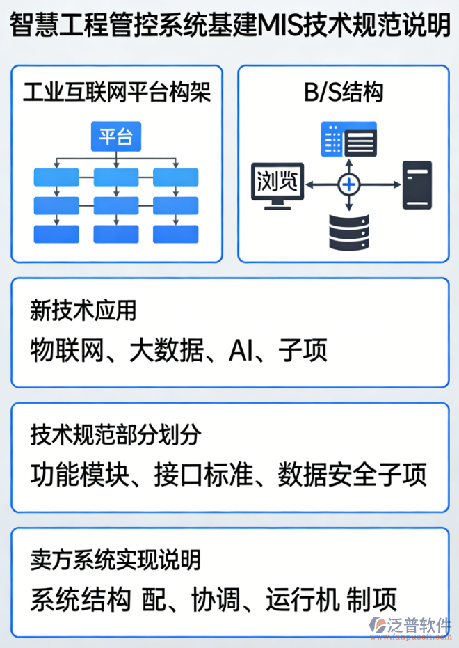 智慧工程管控系統(tǒng)基建MIS采用工業(yè)互聯(lián)網(wǎng)平臺構(gòu)架,軟件平臺采用B/S結(jié)構(gòu),易于使用、易于擴展??紤]“新”技術(shù)在智慧工程信息管理的應(yīng)用。對直接用于智慧工程信息管理的技術(shù)規(guī)范要求,本文分若干部分進行說明。需要指出的是:這些部分的劃分并不代表對賣方提供軟件系統(tǒng)的結(jié)構(gòu)要求,而僅僅是出于闡述功能要求的方便。賣方可以根據(jù)自己提供產(chǎn)品的特點,以不同的軟件系統(tǒng)及其結(jié)構(gòu)來滿足本技術(shù)規(guī)范的要求,并對如何實現(xiàn)其協(xié)調(diào)運行予以說明。