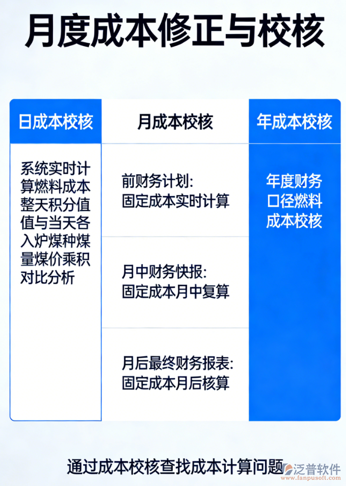 (6)月度成本修正與校核。成本校核根據(jù)時(shí)間維度,將其分為日成 本校核,月成本校核和年成本校核。日成本校核主要是針對(duì)系統(tǒng)實(shí)時(shí)計(jì)算 的燃料成本整天的積分值與當(dāng)天各入爐煤種煤量煤價(jià)乘積進(jìn)行對(duì)比分析。 通過(guò)成本校核,查找成本計(jì)算問(wèn)題。月度成本校核主要是根據(jù)系統(tǒng)自動(dòng)計(jì) 算的實(shí)時(shí)成本累計(jì)和月度財(cái)務(wù)口徑的燃料成本進(jìn)行校核。財(cái)務(wù)報(bào)表依次按 照前財(cái)務(wù)計(jì)劃、月中財(cái)務(wù)快報(bào)、月后最終財(cái)務(wù)報(bào)表進(jìn)行固定成本的實(shí)時(shí)計(jì) 算、月中復(fù)算、月后核算,進(jìn)行三次月度成本的計(jì)算。