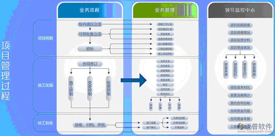 建設工程項目管理的內容根據(jù)建設工程項目管理范圍的具體情況而定。泛普軟件從全面角度而言,項目管理服務可包括如下主要內容:項目前期策劃、可行性研究、設計管理、投資管理、流程管理、合同管理、施工管理、工程變更管理、招投標管理、采購管理等。
