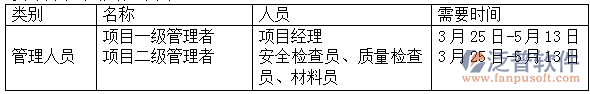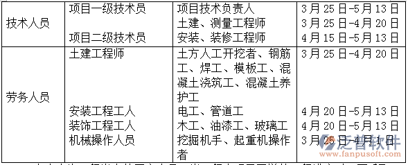上表中為工程當(dāng)中的固定人員,泛普軟件當(dāng)工程出現(xiàn)需要增快工程進(jìn)度時(shí),可采取加班或者在招募一些施工人員。