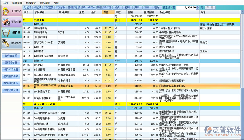 泛普軟件泛普OA系統(tǒng)ERP裝飾管理系統(tǒng)軟件與精打細(xì)算家裝預(yù)算(成本控制)軟件的區(qū)別在于:精打細(xì)算家裝預(yù)算軟件主要針對家裝企業(yè)的,其功能強大,做完預(yù)算程序就將該預(yù)算的用材、人工、機械等成本和預(yù)算的利潤等生成表格,使得裝飾公司可以按照精打細(xì)算家裝預(yù)算軟件生成的一系列表格對裝飾工程進行周密的管理。 但是其缺點是相對專業(yè)一些,對于公司沒有接觸過定額報價的員工來說上手會遲緩一些。