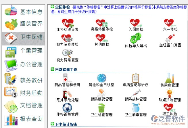 泛普軟件幼兒園管理系統(tǒng)的主要功能有: