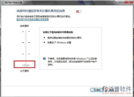 答:在win7中權(quán)限沒有放到最低:控制面板-----》用戶帳戶----》用戶帳戶-----》用戶帳戶控制設(shè)置(如圖一)--—》把權(quán)限調(diào)為從不通知(如圖2)-------》確定-------》重啟