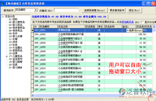 2.對(duì)“倉庫貨品資料選擇窗口”進(jìn)行優(yōu)化,可以自由改變大小: