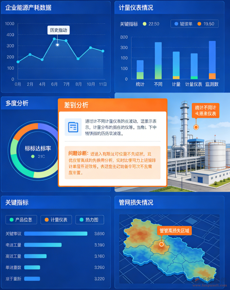 對(duì)企業(yè)能源產(chǎn)耗數(shù)據(jù)、能源計(jì)量?jī)x表情況、能源關(guān)鍵指標(biāo)、主要管網(wǎng)損失情 況,泛普軟件多維度反映企業(yè)能源的消耗狀況、計(jì)量情況、損失狀況、指標(biāo)波動(dòng),發(fā)現(xiàn)不足與差距,分析找出能源產(chǎn)耗存在的問題。