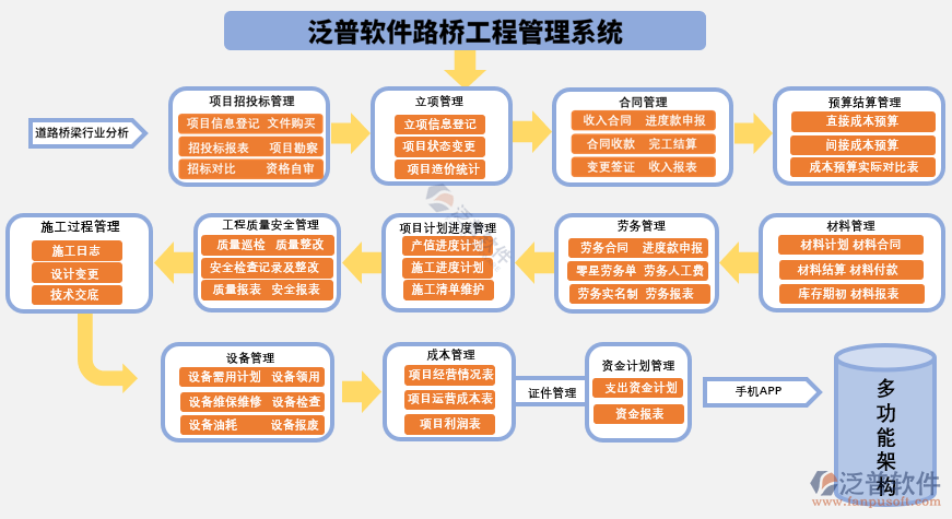 泛普軟件的路橋工程管理系統(tǒng)再使用當中不同信息管理系統(tǒng)之間的信息資源能有效共享,通過一體化的管理平臺,集成了經(jīng)營管理、項目管理、物資管理、財務(wù)管理、辦公管理、人力資源管理六大子系統(tǒng),上百個功能模塊,可以幫助工程施工企業(yè)實現(xiàn)從項目投標到項目實施、以及后期進行項目進度的全過程管理,并且可以快速整合全公司各部門的信息,全公司人員可以共用這一個平臺,實現(xiàn)“全程化、一體化、移動化”的溝通和業(yè)務(wù)處理,以及科學(xué)化決策