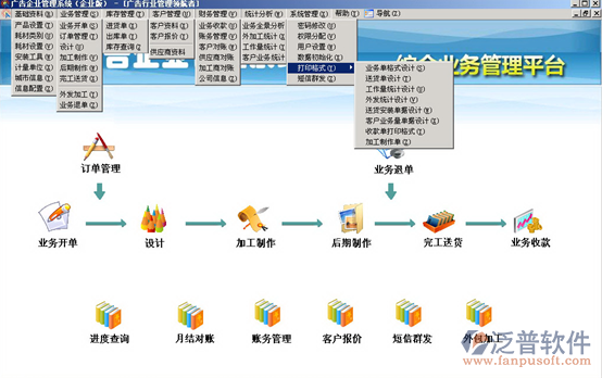 功能簡介:業(yè)務(wù)開單,訂單管理,客戶對(duì)賬,庫存管理,供應(yīng)商對(duì)賬,外包加工對(duì)賬,業(yè)務(wù)制作流程管理(業(yè)務(wù)員受理訂單并進(jìn)行設(shè)計(jì)上傳圖文,制作員受理訂單下載圖文進(jìn)行制作,后期制作),進(jìn)行員工工作量統(tǒng)計(jì)、安裝送貨、收款、客戶月結(jié)對(duì)賬、財(cái)務(wù)管理、業(yè)務(wù)統(tǒng)計(jì)分析。