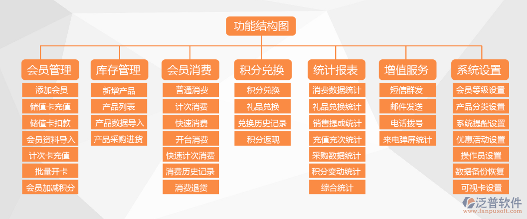 泛普軟件連鎖店會(huì)員卡管理系統(tǒng)用于連鎖店的VIP會(huì)員管理,分為三部分