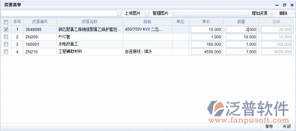 在圖-<施工報(bào)量.資源清單>中,如果預(yù)算的資源不足,可以點(diǎn)擊“增加資源”,從資源庫中增加人工、材料、機(jī)械資源。窗口列表上方,可以選擇上傳資源的圖片,并對(duì)上傳的圖片進(jìn)行管理。點(diǎn)擊“保存”即可。施工報(bào)量添加成功后如下圖: