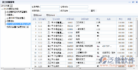 在圖-<施工報(bào)量查詢.瀏覽>中,通過輸入任務(wù)編碼、資源編碼等查詢條件查看通過審核的分項(xiàng)工程使用的資源情況。