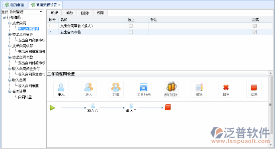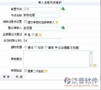 在圖-<流程模板.新增>中,前置節(jié)點(diǎn)不可修改,輸入節(jié)點(diǎn)名稱,流程過程中設(shè)置是提交審核時(shí)選擇審核人,否則選擇默認(rèn)審核人,失效時(shí)限必須填寫,要求審核人在失效時(shí)間內(nèi)完成審核,輸入其他相關(guān)信息,信息輸入無誤后點(diǎn)擊“保存”功能按鈕,流程節(jié)點(diǎn)添加成功,如下圖: