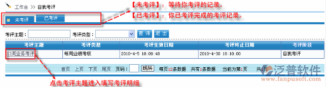 第1步:在“考評(píng)管理”中發(fā)起考評(píng),首先“自我考評(píng)”中進(jìn)行評(píng)定,自我考評(píng)完了以后,自動(dòng)轉(zhuǎn)交給上級(jí)考評(píng)進(jìn)行考評(píng)。
