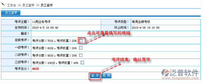 第3步:“上級(jí)考評(píng)”,每位上級(jí)考評(píng)的負(fù)責(zé)人考評(píng)完成以后自動(dòng)轉(zhuǎn)交給下一個(gè)人考評(píng)(最多可以設(shè)置5級(jí),在考評(píng)設(shè)置中設(shè)置),所有的上級(jí)考評(píng)完成以后,就會(huì)提供員工簽字。