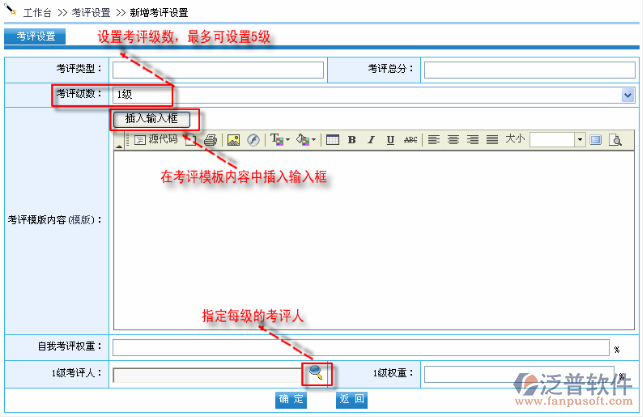 第1步:考評(píng)設(shè)置中設(shè)置好考評(píng)模版,以及考評(píng)級(jí)數(shù),“權(quán)重”的意思就是所占百分比,如自評(píng)為80分,但是權(quán)重為10%,那么自評(píng)分?jǐn)?shù)就為11分。