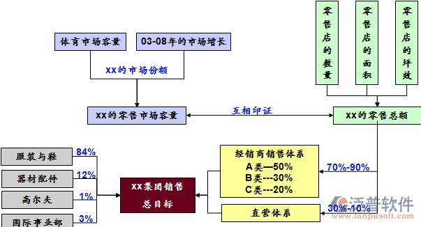 體育產(chǎn)品市場(chǎng)以20%的速度增長(zhǎng),xx的市場(chǎng)份額保持在13%,在2004年的市場(chǎng)是18.7億,2008年是38.8億,基本與xx集團(tuán)的目標(biāo)一致。
