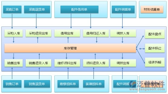 配件業(yè)務(wù)包含采購(gòu)、銷售以及倉(cāng)儲(chǔ)管理,其中倉(cāng)儲(chǔ)管理包含有出入庫(kù)業(yè)務(wù)、庫(kù)內(nèi)盤點(diǎn)與移位管理、組裝拆解管理、調(diào)撥管理,庫(kù)存管理、維修與裝璜領(lǐng)料管理、內(nèi)部借用管理。