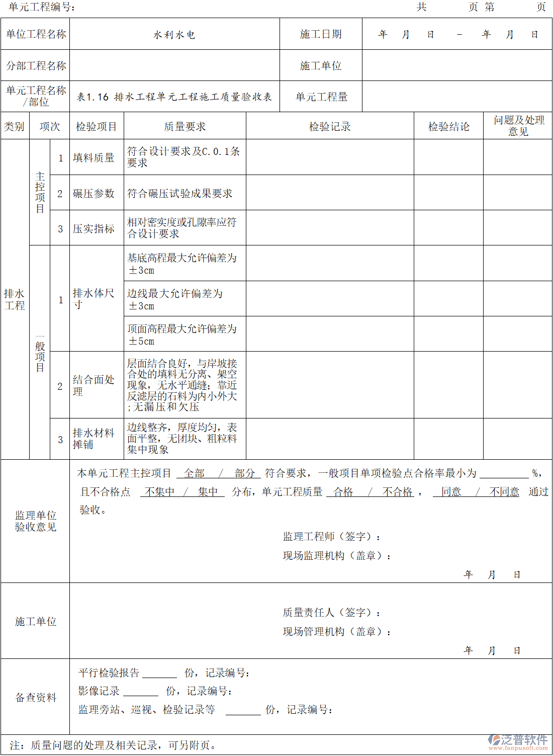 排水工程單元工程施工質(zhì)量驗收表