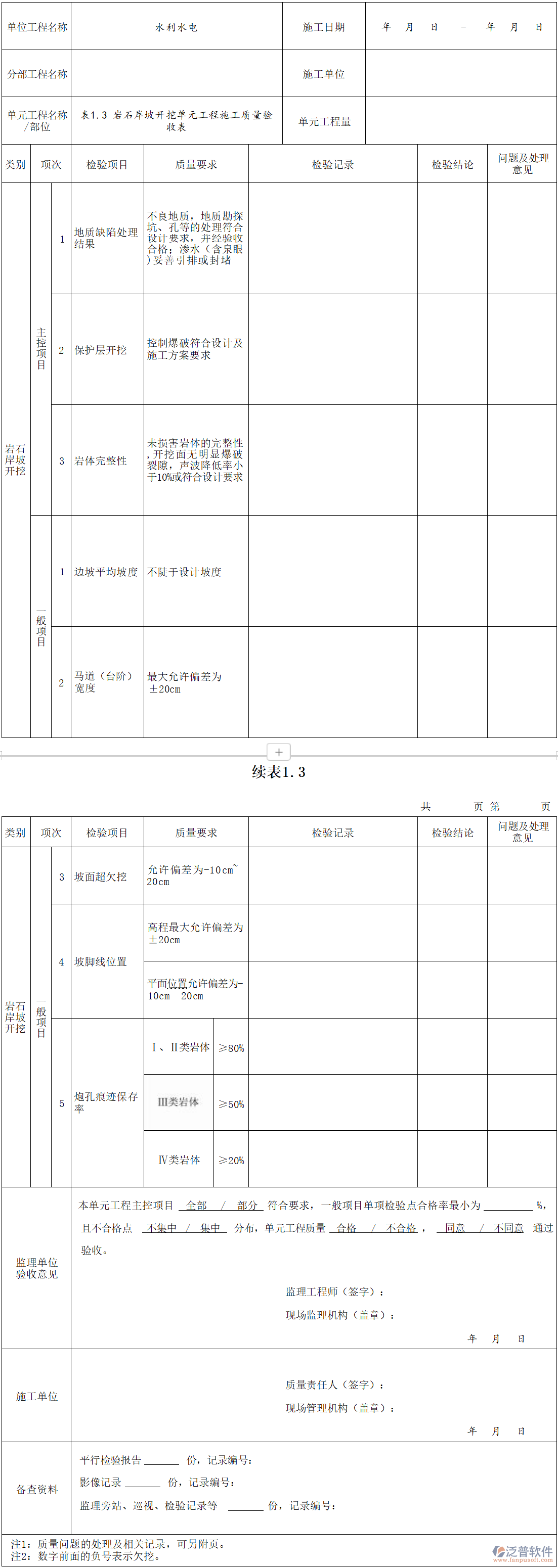 水利水電巖石岸坡開挖單元工程施工質(zhì)量驗收表