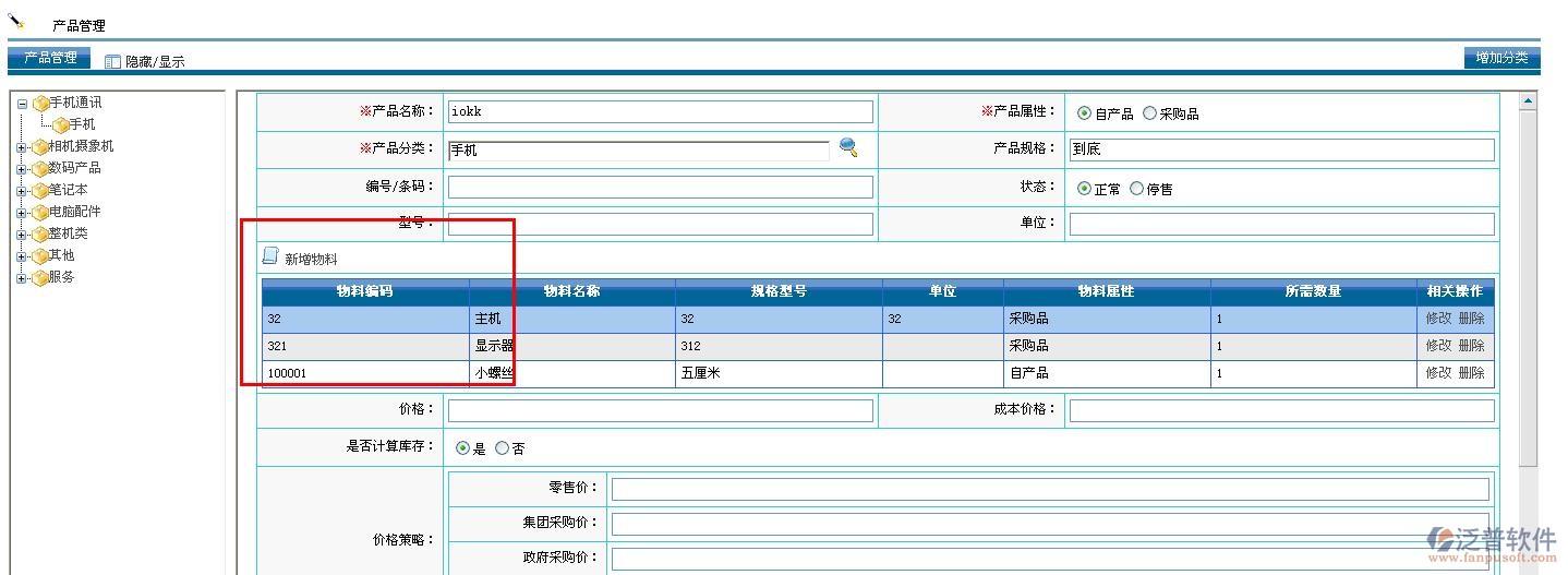 在【生產(chǎn)系統(tǒng)】——【產(chǎn)品管理】中配置物料以及產(chǎn)品對應(yīng)的物料,產(chǎn)品對應(yīng)的物料,在生成采購計劃時需要使用,如圖: