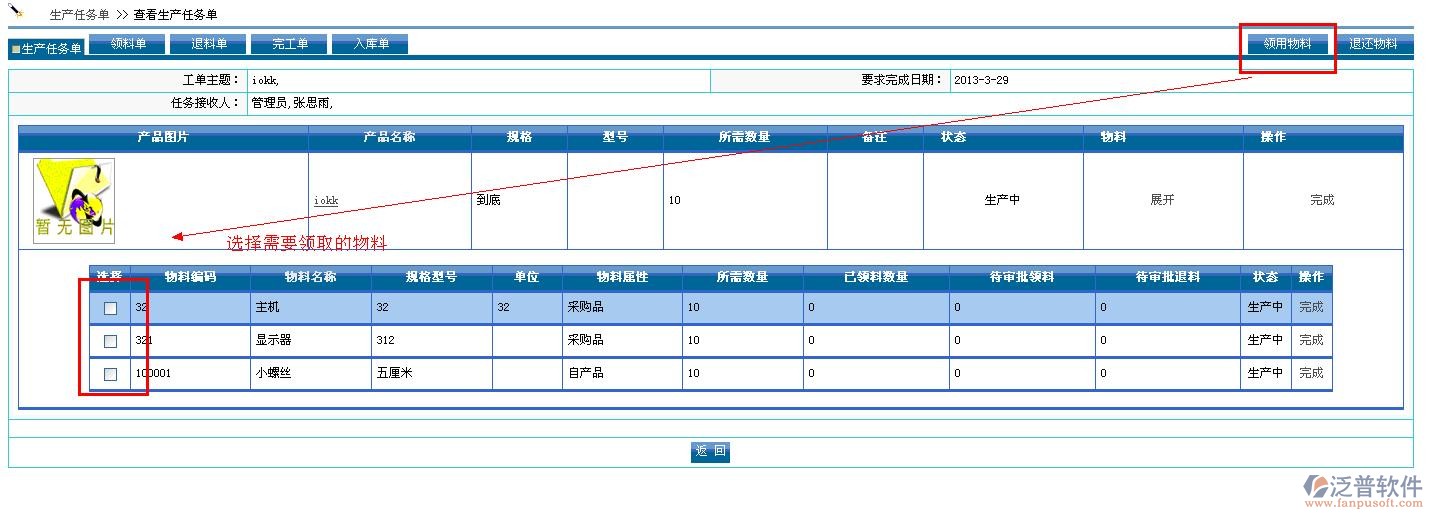 1. 在 【生產(chǎn)任務(wù)單】中可以領(lǐng)用物料、退還物料操作。如圖: