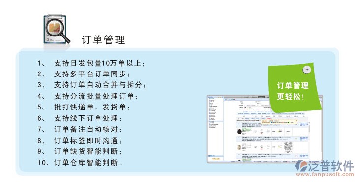 泛普軟件訂單管理系統基于B/S架構、專注于網店、商城的管理系統,集在線進銷存、資金管理、網店管理于一體,遵循傳統訂單管理系統對數據的嚴謹性和準確性的風格,針對電商的運營特點,完全適合電商的業(yè)務操作特性,為電商們提供簡捷的進銷存管理、專業(yè)的財務管理、供應鏈管理、網絡分銷、倉儲物流、終端零售、門店POS、CRM客戶關系、客服績效、辦公OA管理等一體化電子商務訂單管理系統管理平臺,支持淘寶、拍拍、官方商城、網絡分銷等多渠道網絡銷售,以專業(yè)的功能、領先的技術及快速穩(wěn)定的價值體現,贏得眾多客戶選擇。