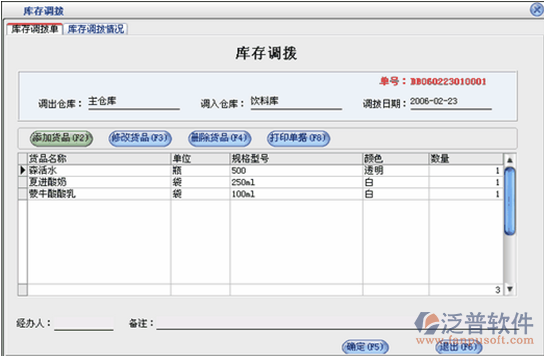 (5)調(diào)撥管理:針對(duì)不同的庫(kù)之間需要調(diào)撥,可以自動(dòng)生成調(diào)撥單號(hào),支持貨品在不同的倉(cāng)庫(kù)中任意調(diào)撥。