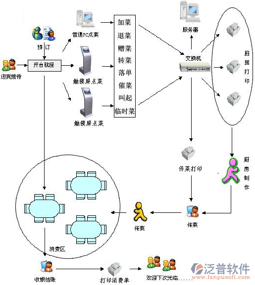 泛普軟件ThinkOne餐廳管理軟件實現(xiàn)了餐廳酒樓日常營運的全面自動管理,包括前臺營業(yè)、基礎(chǔ)設(shè)置、營業(yè)分析、員工管理、客戶管理、庫存管理、系統(tǒng)管理等功能模塊,可以使用觸摸屏、點菜寶或平板電腦進行點菜,支持廚房分單打印、預訂管理、會員儲值積分管理等功能,并可通過Internet對多個分店統(tǒng)一進行連鎖管理。