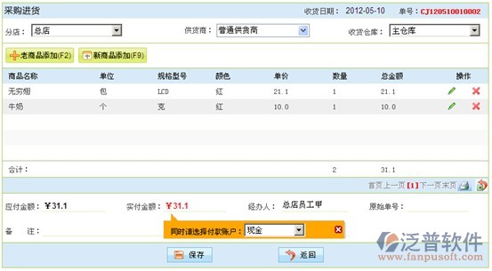 1.1、采購進貨/退貨:下圖是采購進貨操作界面