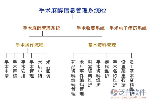 手術(shù)麻醉信息系統(tǒng)采用下拉式漢化菜單,界面友好,實(shí)用性強(qiáng),設(shè)有與住院、病區(qū)、藥房等系統(tǒng)的軟件接口,實(shí)用性強(qiáng),適應(yīng)不同規(guī)模醫(yī)院。R2主要功能劃分如下圖所示: