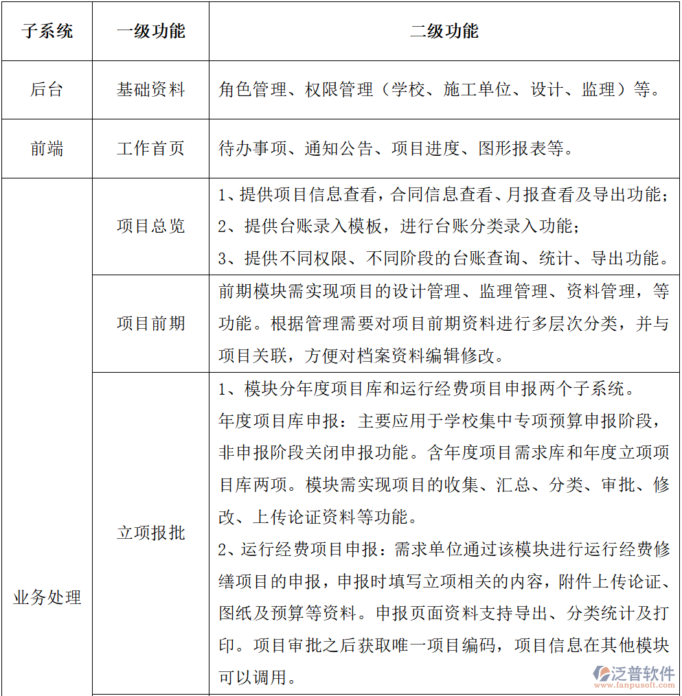 針對(duì)以上情況,XX大學(xué)經(jīng)過(guò)充分調(diào)研與研究,確定泛普基建維修工程管理信息系統(tǒng)將建設(shè)以下內(nèi)容: