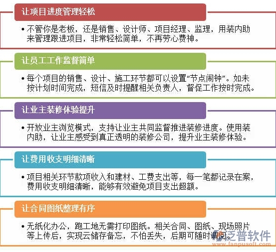 如供應(yīng)管理系統(tǒng)可提供各種裝修材料供應(yīng)商和原料價(jià)格,便于企業(yè)優(yōu)化采購(gòu)系統(tǒng)。進(jìn)度管理系統(tǒng)可以避免工期拖沓,浪費(fèi)時(shí)間,盡快的完成項(xiàng)目,減輕資金占?jí)旱膲毫Α?/p>